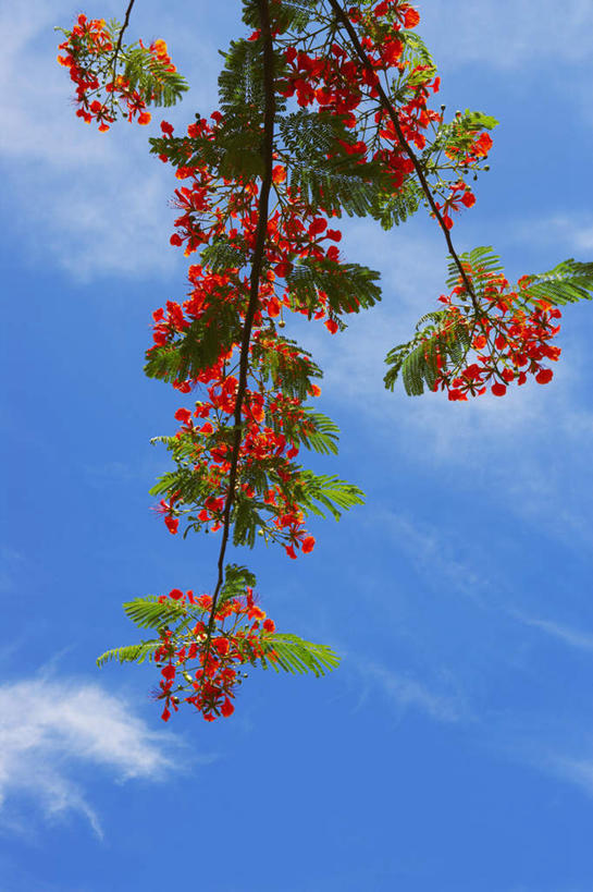 无人,竖图,室外,白天,仰视,旅游,度假,美景,植物,景观,云,云朵,云彩,娱乐,树,树木,蓝色,绿色,白云,蓝天,天空,自然,天,享受,休闲,景色,放松,生长,晴朗,成长,自然风光,凤凰木,红花楹树,凤凰树,火树,红花楹,晴空,彩图,低角度拍摄