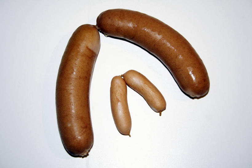 无人,横图,俯视,室内,特写,白天,餐桌,桌子,阴影,灰色背景,反射,影子,肉,香肠,腊肠,四根,猪肉,肉类,摄影,影棚,餐台,肉食,豚肉,彩图,高角度拍摄,影棚拍摄,拍摄