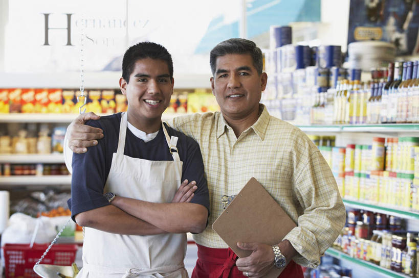 两个人,家庭,父亲,儿子,商店,站,笑,微笑,露齿笑,横图,室内,白天,正面,工作服,制服,购物,消..._淘图客Talkimages图片库