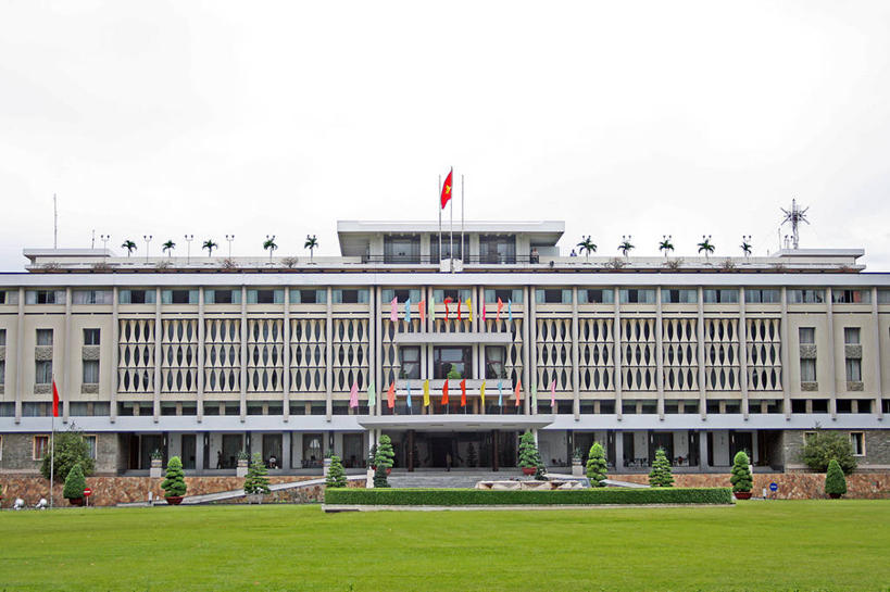 无人,宫殿,横图,室外,白天,建筑,旗帜,越南,历史,草,树,摄影,万里无云,胡志明市,越南国旗,彩图