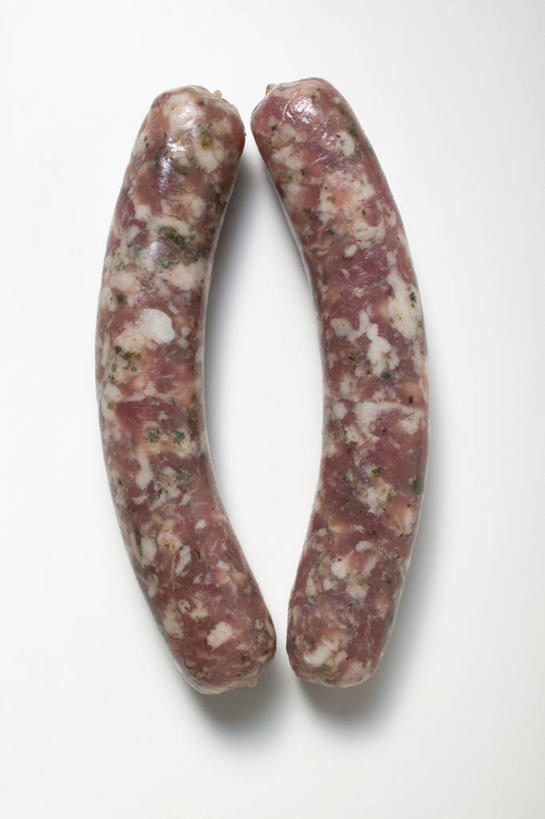 无人,竖图,俯视,室内,特写,白天,白色背景,餐桌,桌子,两根,阴影,反射,影子,肉,香肠,腊肠,猪肉,肉类,摄影,影棚,餐台,肉食,豚肉,德式香肠,彩图,高角度拍摄,影棚拍摄,拍摄